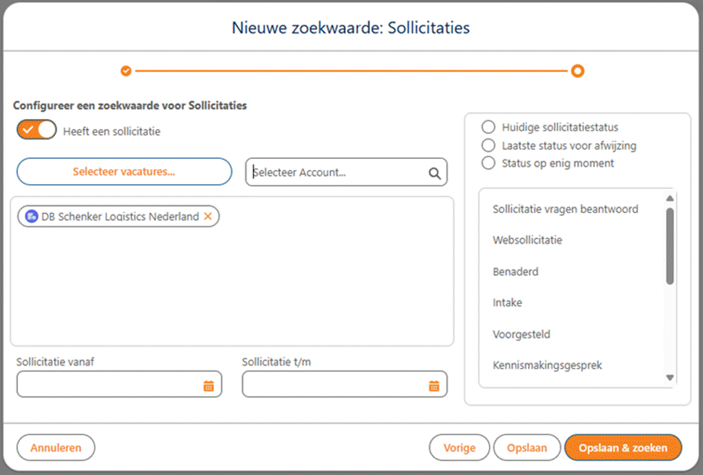 Je kan dan de zoekopdracht natuurlijk verder bewerken, status sollicitatie, afstand, tekst of andere voorwaarden toevoegen.